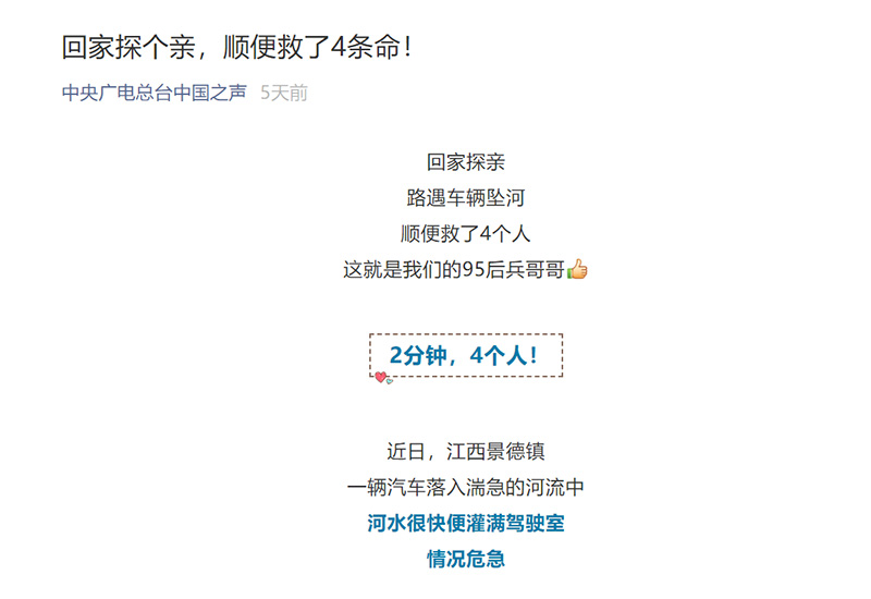 總臺中國之聲微信公眾號報道:回家探個親,順便救了四條命