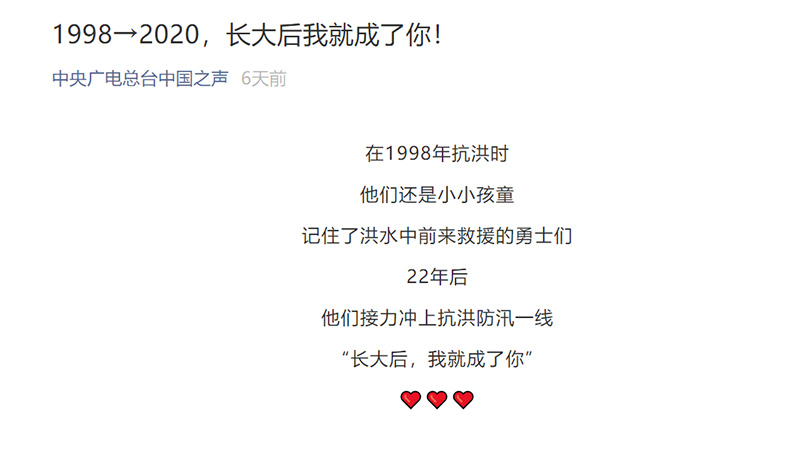 總臺中國之聲微信公眾號報道:1998-2020,長大后我就成了你!