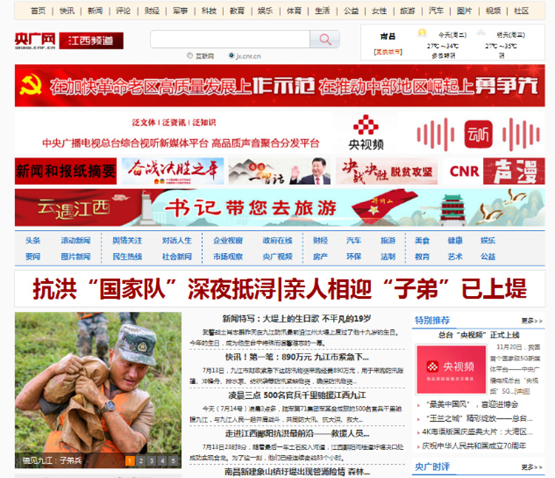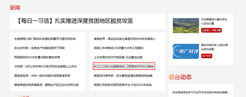 央廣網(wǎng)首頁要聞報道:長江九江段水位超警戒線 江西落實防汛抗災措施