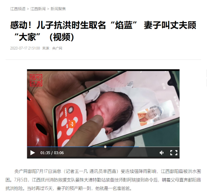 全媒體報道:感動!兒子抗洪時生取名“焰藍”妻子叫丈夫顧“大家”