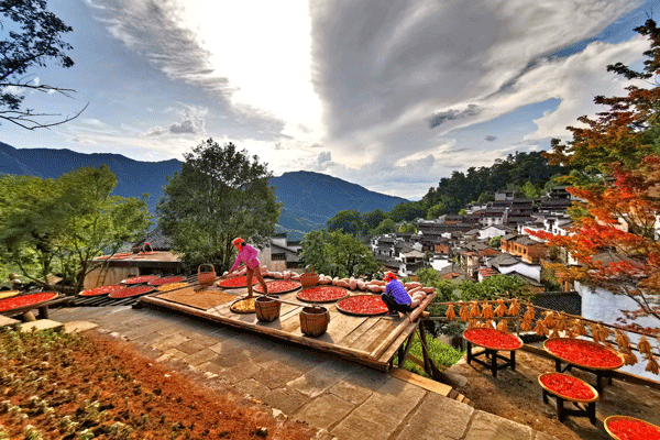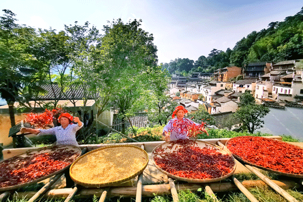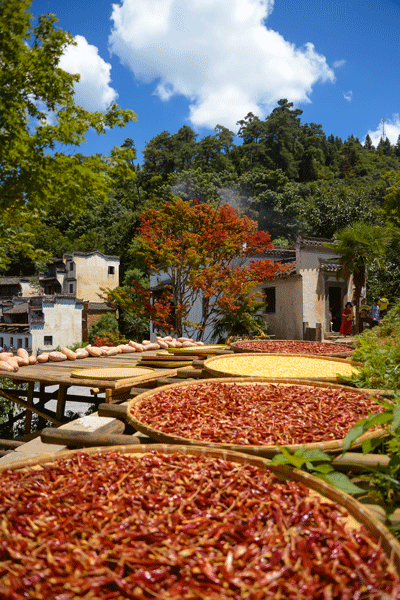 立秋將至,篁嶺古村的農(nóng)作物普遍豐收,又到了一年“曬秋”最美季。篁嶺村民們將收獲來(lái)的紅辣椒、玉米、南瓜和菊花等色彩斑斕的農(nóng)作物,晾曬在依山而建的徽派民居的曬樓上,揭開(kāi)新一年曬秋紅火的序幕。(圖文/方華彬)