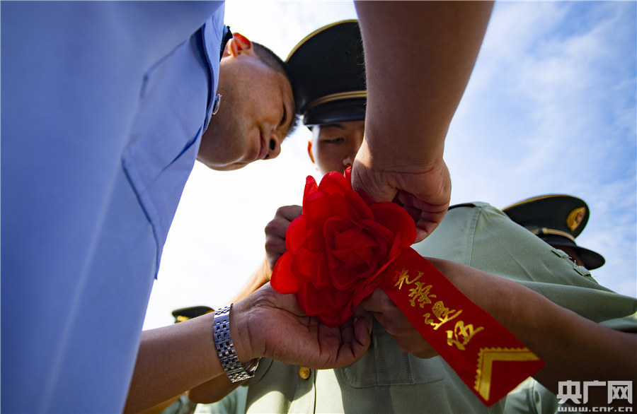 送戰(zhàn)友胸戴紅花(張玉 攝)