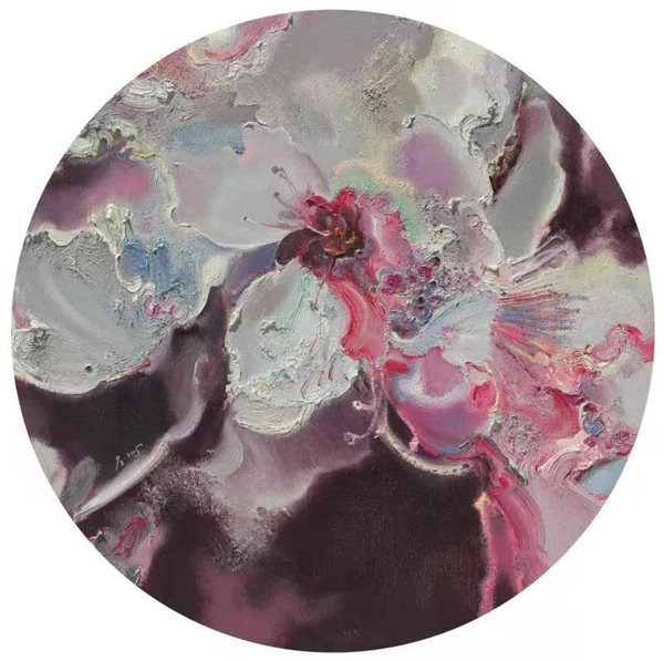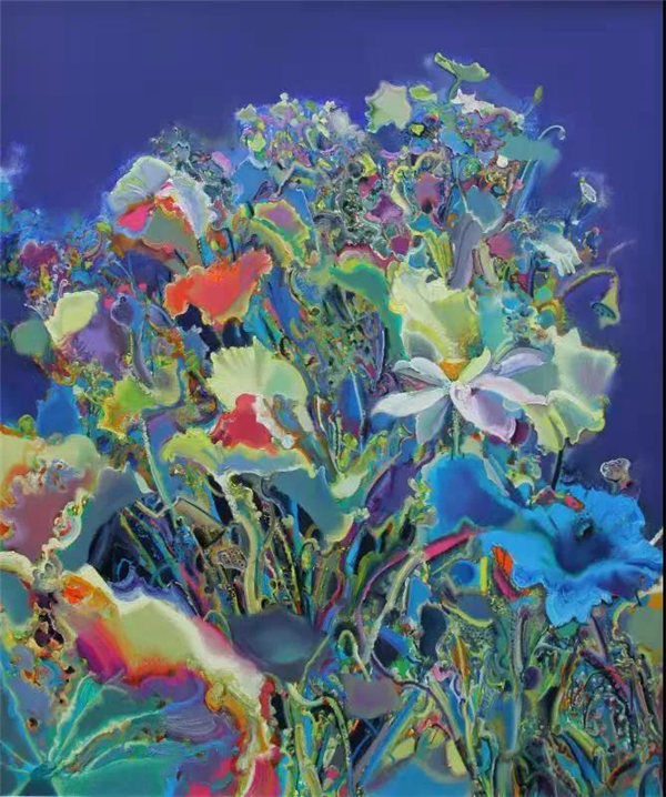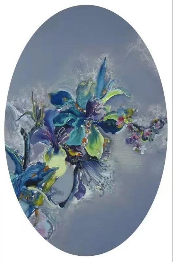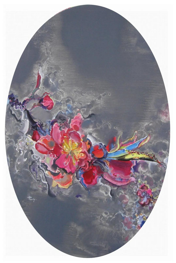 在花卉題材作品中,楊芷先是詩性的消解了花朵的部分外形特征,在似與不似之間,在形與神的取舍之間,表現(xiàn)出花朵的種種相態(tài),或繁盛、凋零,或群聚、獨(dú)處,恰如女性內(nèi)在與外在的依存關(guān)系和出世入世的角色轉(zhuǎn)換。然后,楊芷受到植物變色實(shí)驗(yàn)的啟發(fā),認(rèn)識(shí)到生長環(huán)境與植物狀態(tài)變異間的直接關(guān)聯(lián),便試圖通過花朵固有色常規(guī)與非常規(guī)的復(fù)雜轉(zhuǎn)換來類比揭示諸如環(huán)境質(zhì)量、食品安全,教育、道德、文化等諸多環(huán)境因素對(duì)個(gè)體生存狀態(tài)的各種影響,因此,她筆下花朵的色彩,表現(xiàn)出幻化、奇異、神秘的色彩效果。此時(shí)楊芷筆下的花朵已經(jīng)遠(yuǎn)遠(yuǎn)超越了自然屬性的花朵本身的意義,成為她承載個(gè)人情感、意愿、態(tài)度的符號(hào),這是藝術(shù)家生命責(zé)任感和社會(huì)責(zé)任感的標(biāo)志性體現(xiàn)。