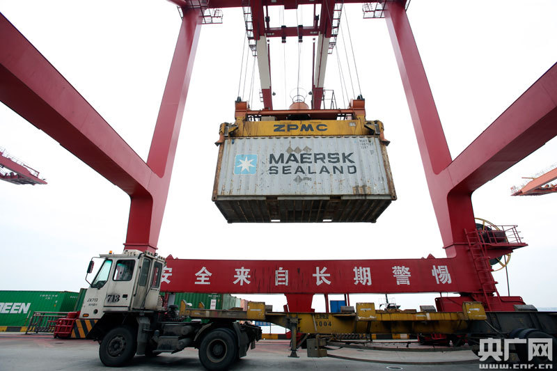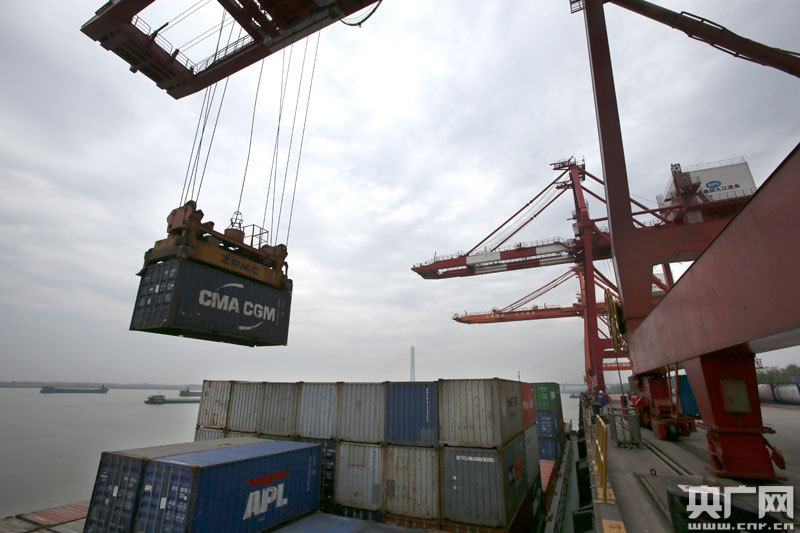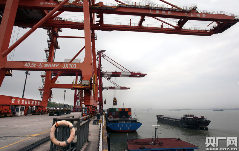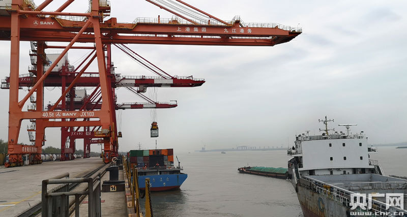 3月16日,上港集團(tuán)九江公司集裝箱碼頭吊裝場景
