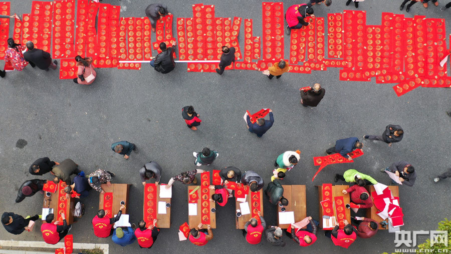 2020年1月8日,江西省吉安市泰和縣文化志愿者走進(jìn)該縣偏遠(yuǎn)山區(qū)——老營盤圩鎮(zhèn),為當(dāng)?shù)厝罕姇鴮懘郝?lián)。(央廣網(wǎng)發(fā) 通訊員司馬天民 攝)