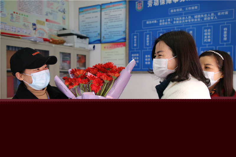 3月6日,“三八”婦女節(jié)前夕,雙溪鎮(zhèn)總工會(huì)工作人員把開(kāi)得正盛的鮮花送到抗“疫”一線社區(qū)女工作人員手中。