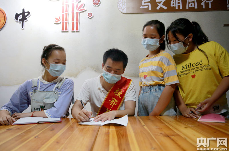 孩子們請?jiān)蹩挂哂⑿酆f峰為自己簽名留言(央廣網(wǎng)發(fā) 通訊員廖敏 攝)