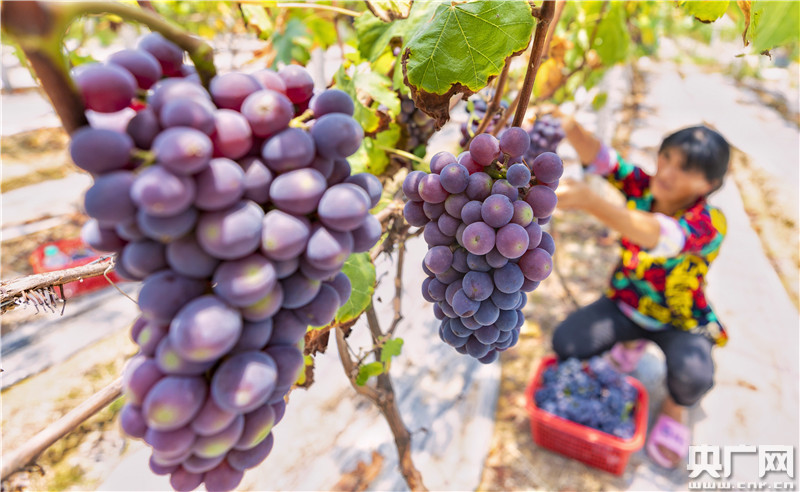 2020年6月15日,江西省吉安市泰和縣苑前鎮(zhèn)巷口村的生態(tài)葡萄園喜獲豐收,果農(nóng)正開(kāi)心采摘紫色葡萄。