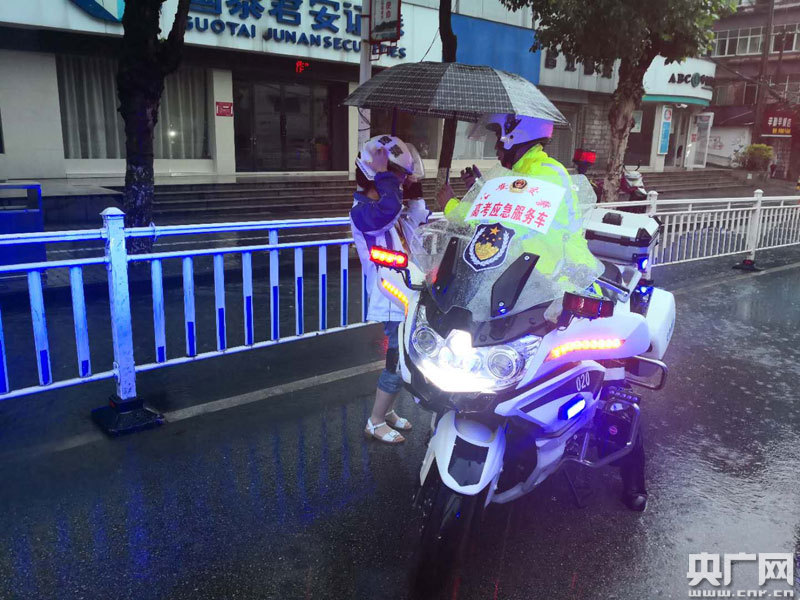 景德鎮(zhèn)市公安局交警支隊鐵騎隊于6點50分等候在昌南大道路口,準備押送高考試卷前往景德鎮(zhèn)四個考點,以確保萬無一失。就在最后一輛鐵騎準備出發(fā)前往二中考點時,路邊一名獨自撐傘的女生奔向鐵騎隊員,向他請求幫助。原來她是今年參加高考的考生,由于當時所處瓷都大道地段水淹,公交車改線,一時不知道怎么去考場。當即,鐵騎隊員當即脫下了雨衣披在考生身上。隨即,鐵騎隊搭載這名考生,一路護送著高考考卷,順利抵達二中考點。