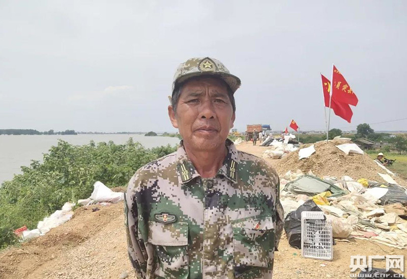 江海輝是位54歲的老黨員,1998年為抗擊洪水,他曾三天三夜未合眼。面對今年比那時還要大的洪水,7月7日上午接到鄉(xiāng)政府通知后,自告奮勇?lián)未笪荽迕癖犻L。十多天來,他帶領(lǐng)村里民兵隊,裝沙袋、挖溝導(dǎo)流,哪里有險情,哪里就有他的身影。因為自己有98年的抗洪經(jīng)歷和每年參與汛期湖堤巡防的經(jīng)驗,盡管白天已經(jīng)非常疲憊了,他還不放心別人去巡查,堅持親自上陣。7月19日,見到他時,聲音干啞,手機來電不斷,因為天氣太熱,似有中暑癥狀,干起體力活有點力不從心。村支書江勝柱見他因為中暑長時間沒進食,靠喝葡萄糖補充體力。勸他回去好好休息。但他說:“回不得,不能回!看著官兵們頂著烈日暴曬、扛著蚊蟲叮咬,保護我們的家園。我要是回去休息了,怎么對得?洪水不退,我不能退!彼硎疽欢ㄒ獔猿值桔蛾柡煌讼戮渚的那一天。