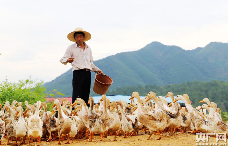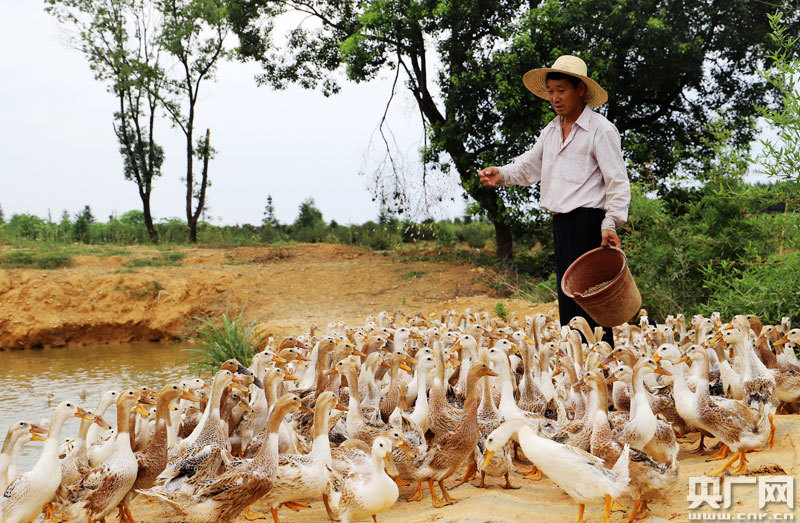 安?h洲湖鎮(zhèn)汶源村王三傳在喂鴨(央廣網(wǎng)發(fā) 通訊員劉麗強(qiáng) 攝)