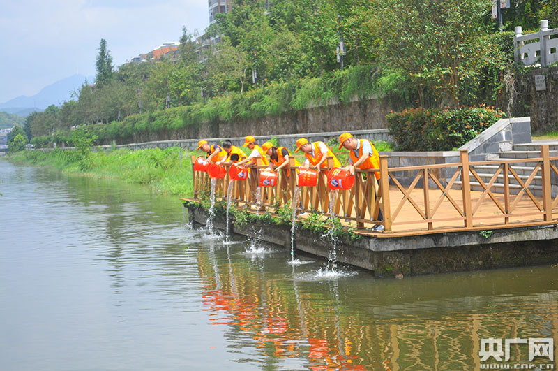 河長制管理志愿者們進(jìn)行魚苗放生,凈化水質(zhì)(央廣網(wǎng)發(fā) 通訊員陳聲年 攝)