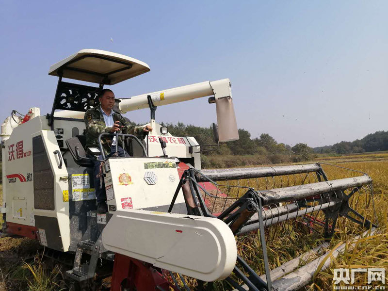 進(jìn)入10月底,正值晚稻收割期,在余江區(qū)馬荃鎮(zhèn)吳友發(fā)的莊稼源果蔬專業(yè)合作社,吳友發(fā)正駕駛著收割機(jī)在一片稻浪中馳騁。