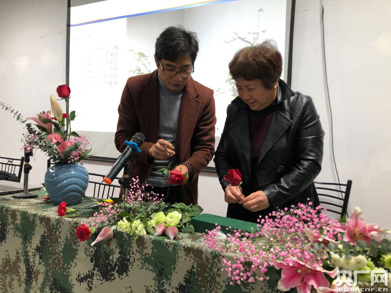 在園藝?yán)蠋煹闹笇?dǎo)下,學(xué)習(xí)插花藝術(shù)(央廣網(wǎng)發(fā) 通訊員供圖)
