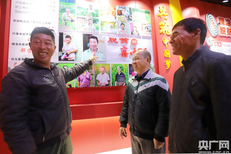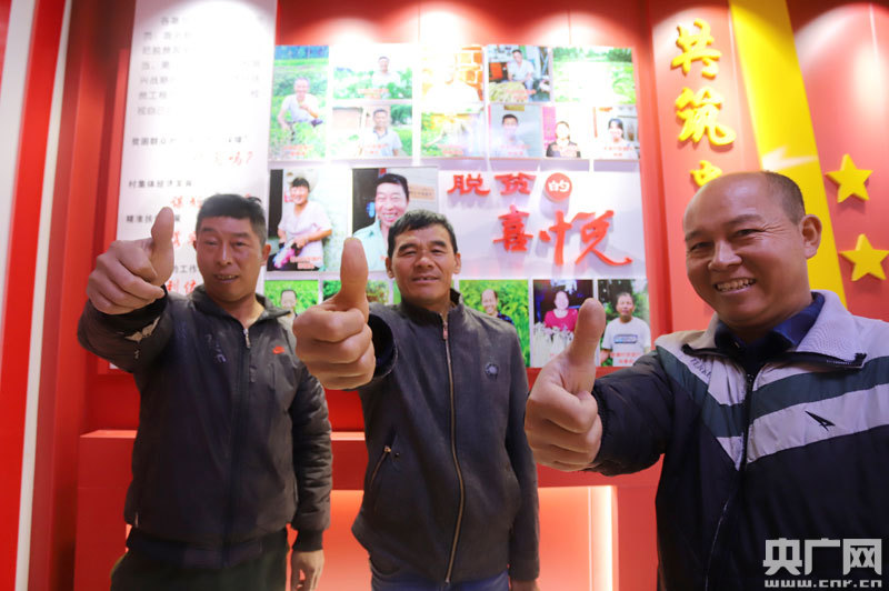 寮塘鄉(xiāng)“最美脫貧戶”楊長生(左)、劉香寶(中)、楊國寶(右)在“笑臉墻”前點(diǎn)贊黨和政府的扶貧政策(央廣網(wǎng)發(fā) 通訊員供圖)