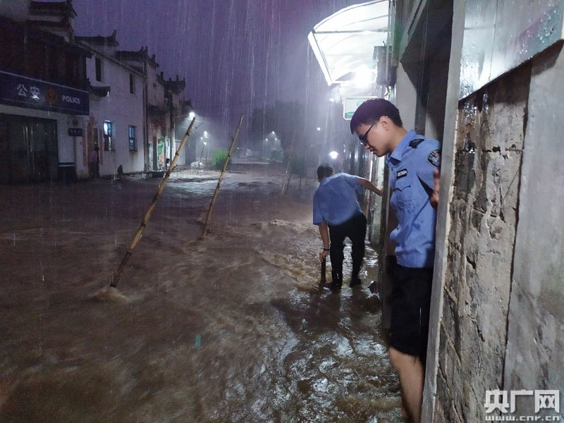 當(dāng)晚7時(shí)許,沱川鄉(xiāng)的強(qiáng)降雨已持續(xù)了4個(gè)多小時(shí),洪水造成理坑村及沿河村落被淹,村下村敬老院附近電箱損壞,學(xué)?盏乇谎蜎](méi)。面對(duì)突發(fā)的災(zāi)情,沱川派出所立即啟動(dòng)防汛處置應(yīng)急預(yù)案,調(diào)集全部警力,所長(zhǎng)張小波帶隊(duì),奔赴災(zāi)區(qū),疏通水毀道路、搶救受災(zāi)財(cái)物、轉(zhuǎn)移被困群眾。