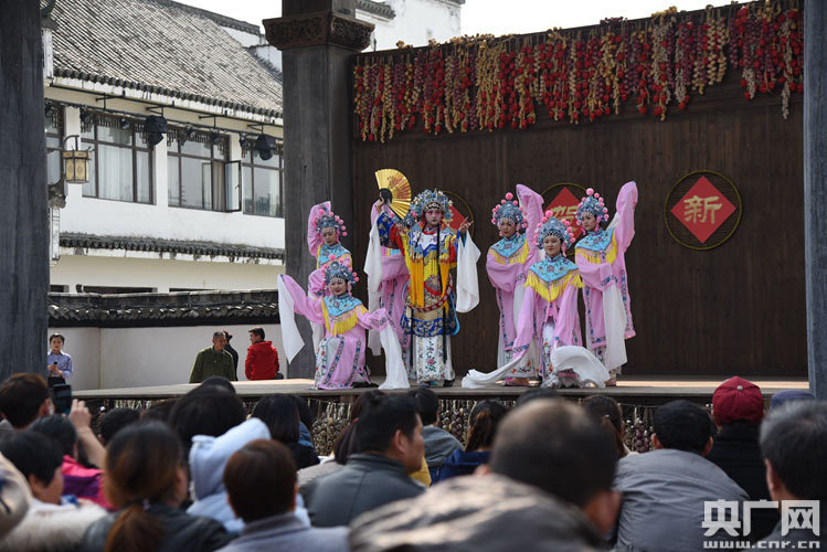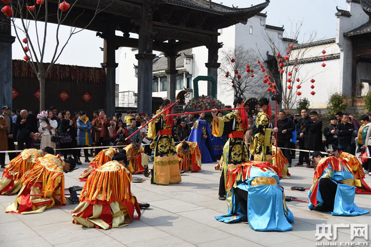 婺源充分發(fā)揮豐富的非遺文化資源優(yōu)勢(shì),打造極具特色的“演藝小鎮(zhèn)”,推動(dòng)旅游文化產(chǎn)業(yè)大發(fā)展,吸引了眾多游客前來觀看。3月11日,游客在婺源夢(mèng)里老家演藝小鎮(zhèn)欣賞極具當(dāng)?shù)靥厣膰?guó)家級(jí)非遺項(xiàng)目——儺舞和徽劇表演。(央廣網(wǎng)發(fā) 通訊員單長(zhǎng)華攝)