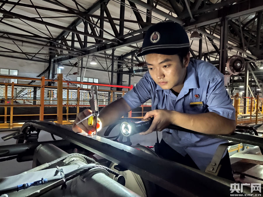 南昌西所專項修組工長吳宿正在對走行部進行檢查