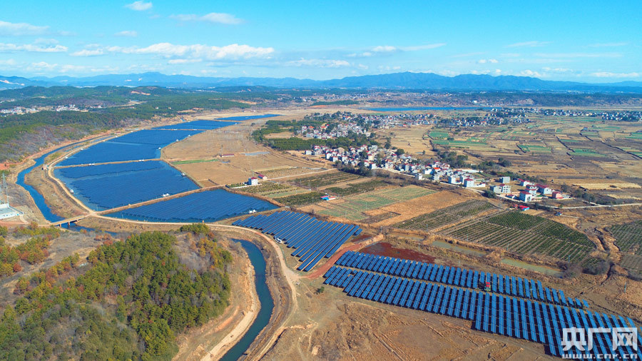 1月7日,在江西省吉安市泰和縣萬合鎮(zhèn)前進(jìn)村 “漁光互補(bǔ)”光伏扶貧發(fā)電項(xiàng)目,沿河道成弧形排列的光伏板,與藍(lán)天白云相映成趣,蔚為壯觀。近年來,泰和縣在推進(jìn)脫貧攻堅(jiān)工作中,將光伏發(fā)電項(xiàng)目納入扶貧的主導(dǎo)產(chǎn)業(yè),利用贛江老河道發(fā)展“漁光互補(bǔ)”光伏扶貧發(fā)電項(xiàng)目,實(shí)現(xiàn)水面養(yǎng)魚、水上發(fā)電,“一地兩用”創(chuàng)造雙份收益,助力脫貧攻堅(jiān)。 (央廣網(wǎng)發(fā) 通訊員鄧和平 攝)