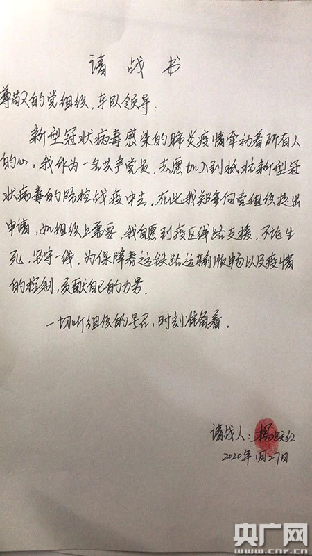 “我作為一名共產(chǎn)黨員,自愿加入到抵抗新型冠狀病毒的防控戰(zhàn)‘疫’中去!1月27日,南昌客運段D736次列車員楊躍紅寫下了一封請戰(zhàn)書。