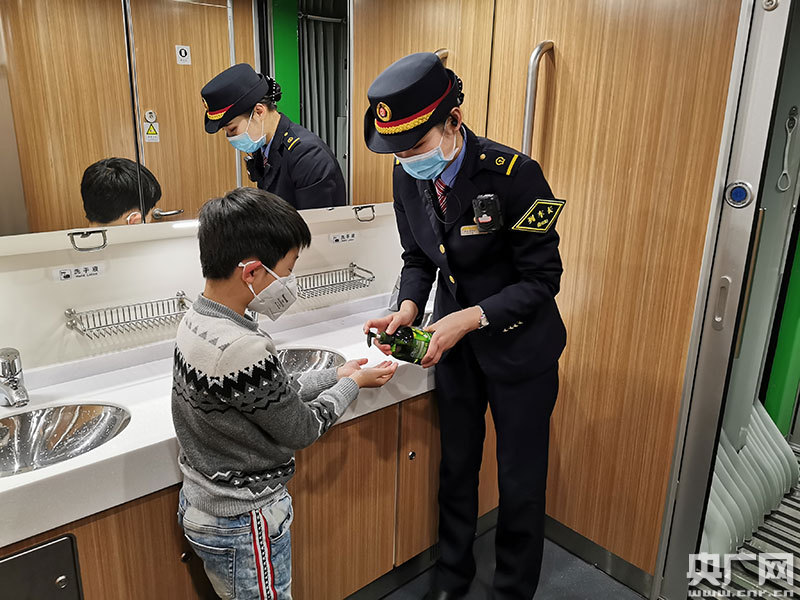 南昌客運(yùn)段由南昌開(kāi)往北京西的D738次列車(chē)上,列車(chē)長(zhǎng)劉雅夢(mèng)悉心的向小旅客介紹洗手步驟,為有需要的旅客提供口罩并介紹正確的戴法。(記者范存寶/攝)