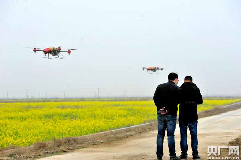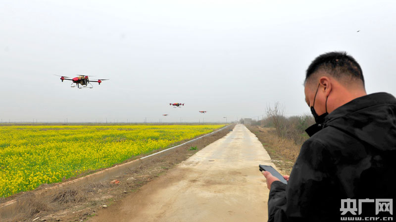 農(nóng)技人員和農(nóng)戶利用無人機(jī)設(shè)備開展油菜田植保作業(yè)