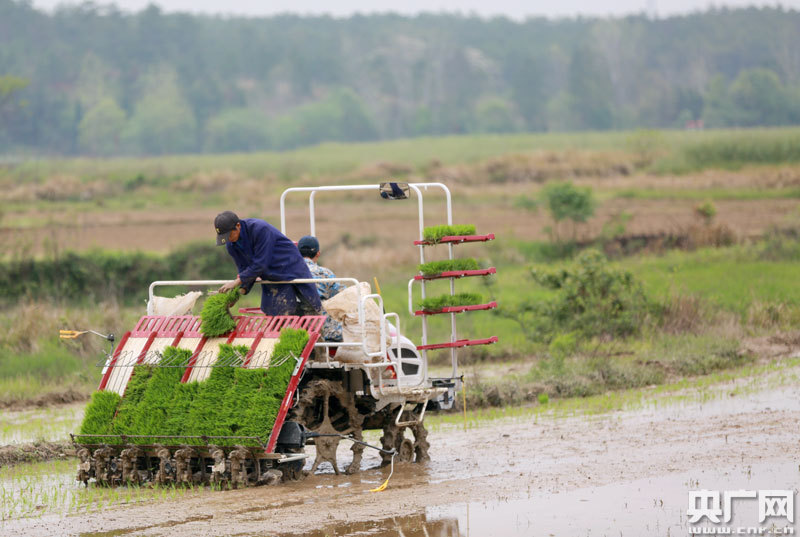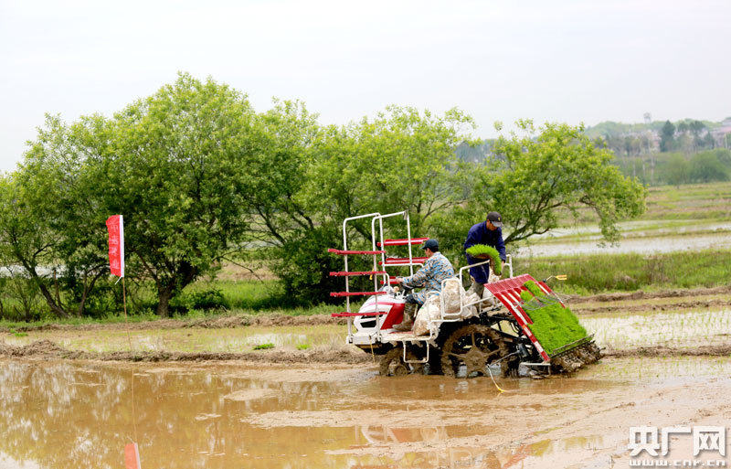4月14日,江西省吉安市吉水縣尚賢鄉(xiāng)田螺邊村農(nóng)機來回穿梭,該縣中波農(nóng)機服務隊的操作手正駕駛著插秧機進行春播。