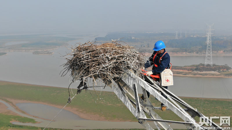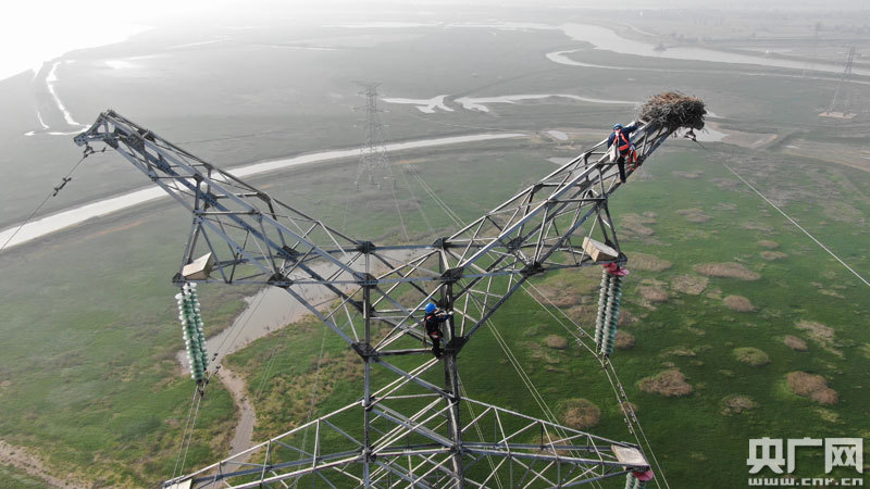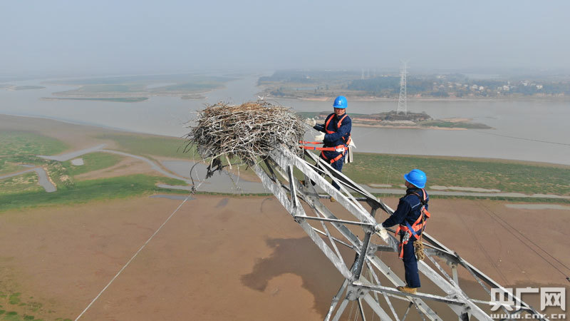 隨著天氣轉(zhuǎn)冷,大批候鳥飛抵鄱陽湖。因?yàn)闁|方白鸛習(xí)慣飛回舊巢,電力部門為了保障輸電設(shè)施安全給這座鐵塔安裝了防鳥糞設(shè)備,還專門安排工人上塔對鳥巢進(jìn)行加固,既保供電又保候鳥。