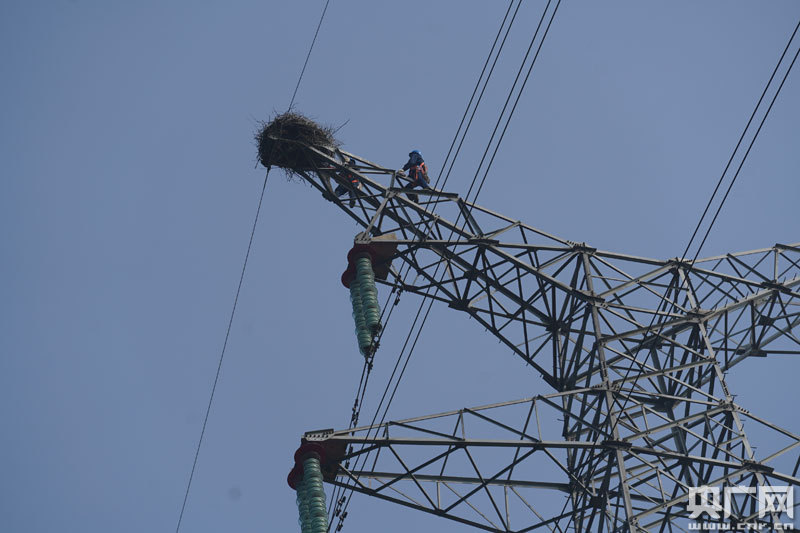 電力工人爬上鐵塔加固鳥巢(央廣網(wǎng)發(fā) 通訊員提供)