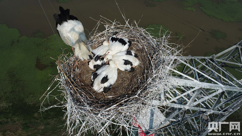 今年2月,國網(wǎng)江西電力南昌供電公司輸電管理中心的工作人員,在南昌市進(jìn)賢縣青嵐湖水域中央的一座鐵塔上發(fā)現(xiàn)一對東方白鸛和一窩蛋。電力工人們遠(yuǎn)遠(yuǎn)地觀察著東方白鸛一家,看著小白鸛一點(diǎn)點(diǎn)長大,直到它們飛離鄱陽湖。