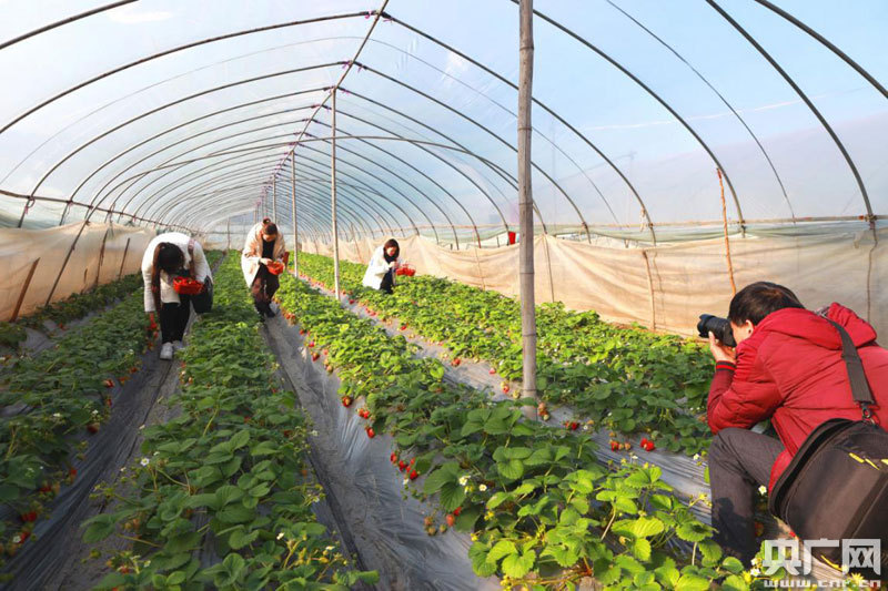 “這草莓又大又紅、又香又甜,周末帶著女兒來體驗采摘、吃吃農(nóng)家樂,非常舒服!碑斍罢悄逃筒葺迈r上市的時節(jié),自駕前來采摘草莓的游客絡(luò)繹不絕。走進大棚,一壟壟果苗整齊劃一,掛滿了透紅可人的新鮮草莓,煞是可愛。一波波游客正提著塑料筐,在嫩綠的葉子中精心挑選成熟的草莓,不一會兒,手里的籃筐就裝滿了草莓,一邊品嘗酸甜可口的草莓,一邊拿出相機、手機記錄這開心的瞬間,歡聲笑語在溫暖的大棚里飄蕩。