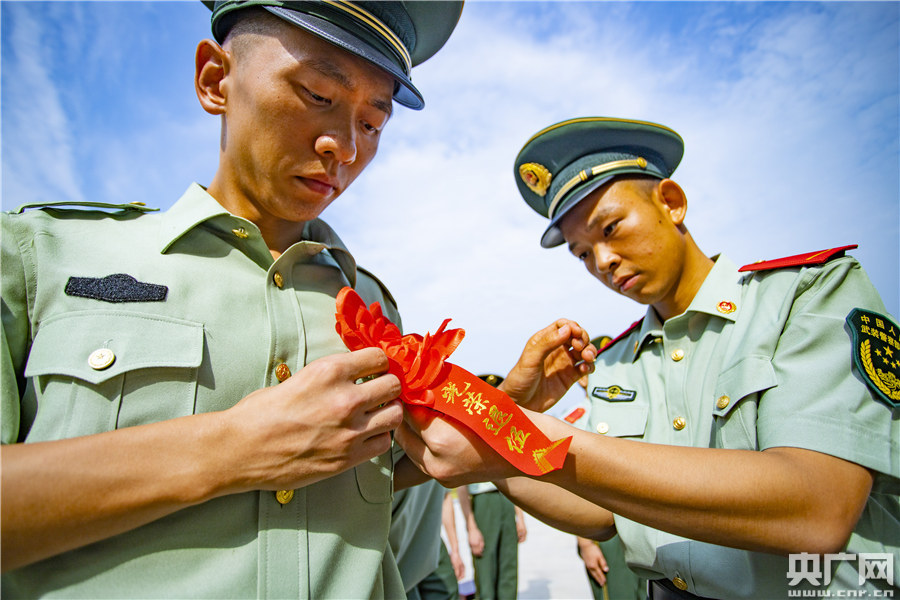 送戰(zhàn)友胸戴紅花(張玉 攝)