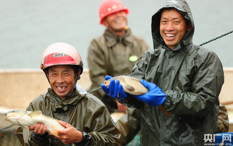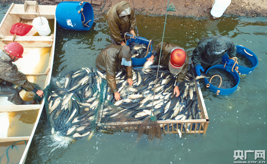 11月18日,在江西省吉安市泰和縣火爆種養(yǎng)專業(yè)合作社生態(tài)魚養(yǎng)殖基地,農(nóng)民正在捕魚。立冬后,泰和縣進(jìn)入冬季捕魚繁忙時(shí)節(jié),漁農(nóng)紛紛開展捕撈,供應(yīng)市場。近年來,泰和縣大力發(fā)展生態(tài)水產(chǎn)養(yǎng)殖產(chǎn)業(yè),以“安全、生態(tài)、環(huán)!睘槔砟,引導(dǎo)漁農(nóng)推廣應(yīng)用魚類免疫、測水投料及微生態(tài)制劑調(diào)節(jié)水質(zhì)等集成健康養(yǎng)殖技術(shù),進(jìn)行生態(tài)養(yǎng)殖,提高了附加值,助力漁農(nóng)增收。(央廣網(wǎng)發(fā) 鄧和平 攝)