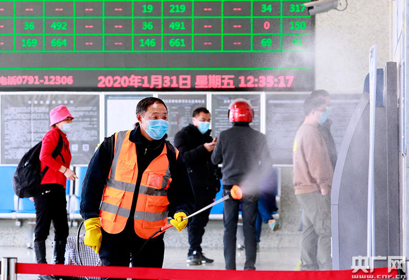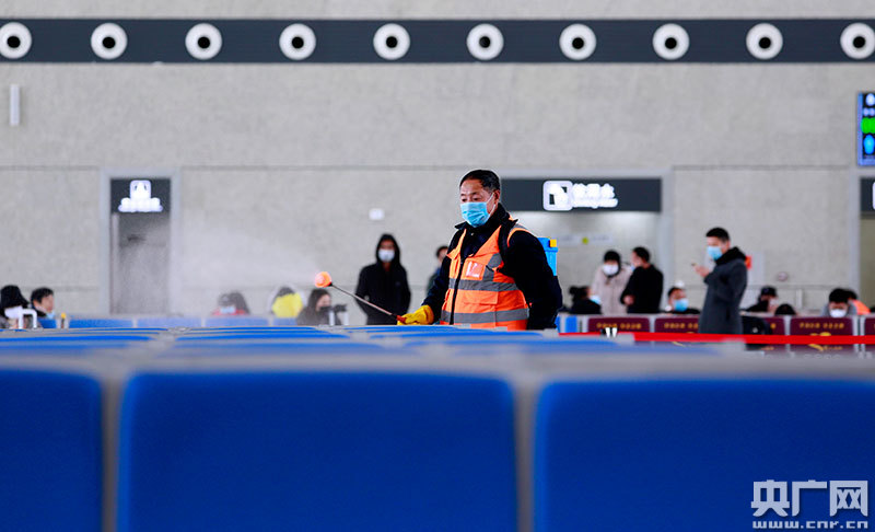 1月31日,在江西省吉安市泰和縣火車站,工作人員對候車大廳進(jìn)行消毒(司馬天民/攝)