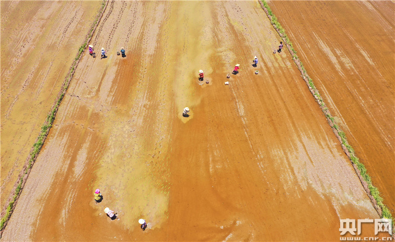 6月17日,在江西省吉安市泰和縣澄江鎮(zhèn)官溪村,農(nóng)民搶抓農(nóng)時正在播種中稻。