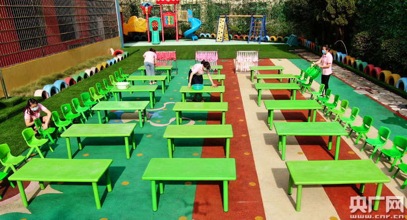 幼兒園老師們在檫洗、晾曬課桌(央廣網發(fā) 通訊員李軍 攝)