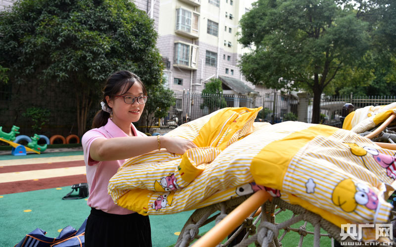 幼兒園老師趁著好天氣晾曬棉被(央廣網發(fā) 通訊員李軍 攝)