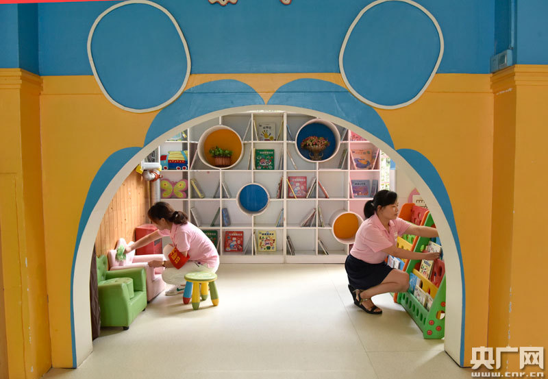 幼兒園老師整理小朋友們的書屋,迎接小朋友(央廣網發(fā) 通訊員李軍 攝)