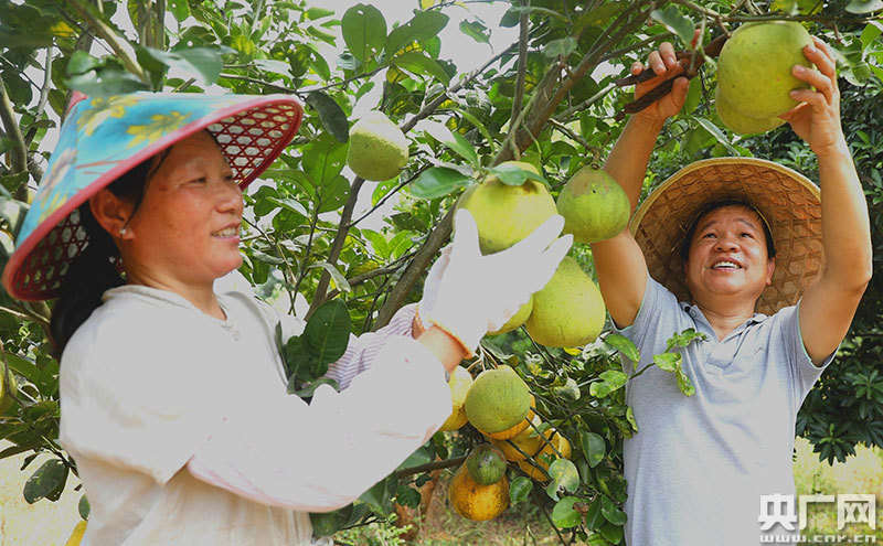 肖浩林夫妻在自家庭院采摘柚子(央廣網(wǎng)發(fā) 通訊員供圖)