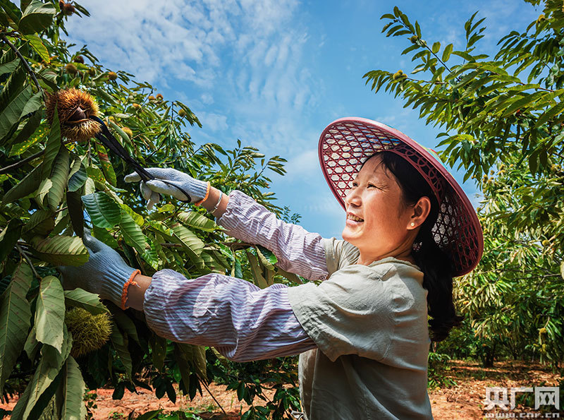 肖浩林妻子在自家庭院采摘板栗(央廣網(wǎng)發(fā) 通訊員供圖)
