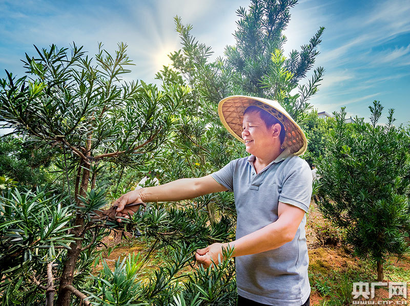 肖浩林在自家庭院護(hù)理羅漢松樹(shù)(央廣網(wǎng)發(fā) 通訊員供圖)