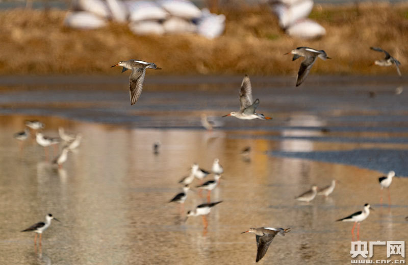 數(shù)不清的黑翅長腳鷸在鄉(xiāng)村自由飛翔(央廣網(wǎng)發(fā) 通訊員趙春亮 攝)