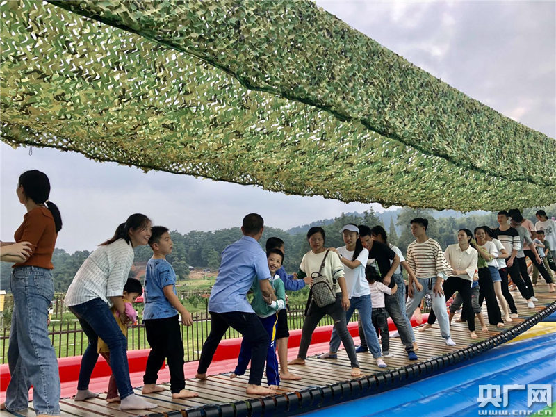 在山莊大智鄉(xiāng)村旅游點(diǎn),游客們網(wǎng)紅橋上玩興正嗨。
