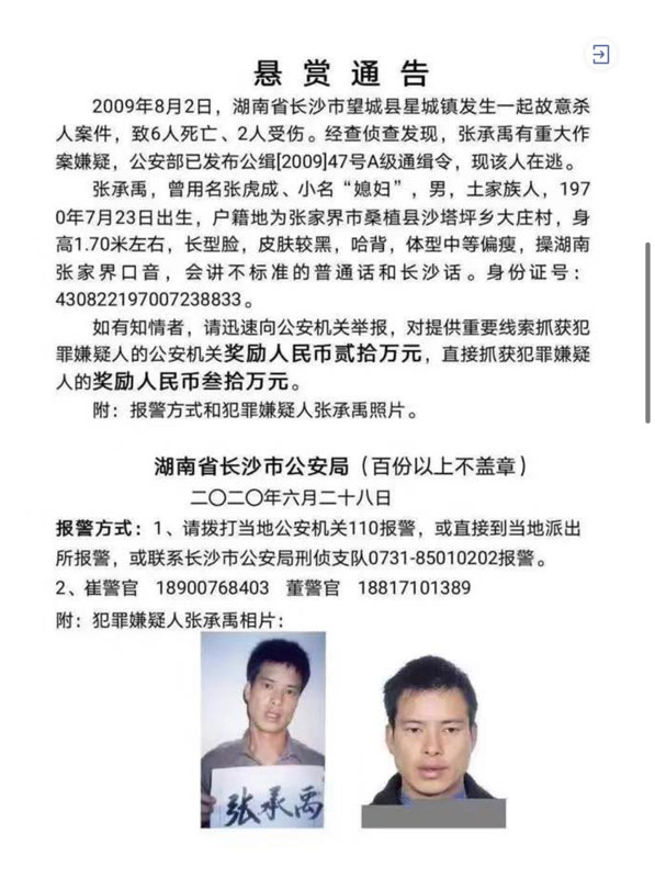 據(jù)2020年6月28日湖南省長沙市公安局發(fā)布的懸賞公告顯示,張承禹,曾用名張虎成,小名“媳婦”,男,土家族人,1970年7月23日出生,戶籍地為張家界市桑植縣沙塔坪鄉(xiāng)大莊村,身高1.70米左右,長型臉,皮膚較黑,哈背,體型中等偏瘦,操湖南張家界口音,會講不標(biāo)準(zhǔn)的普通話和長沙話。