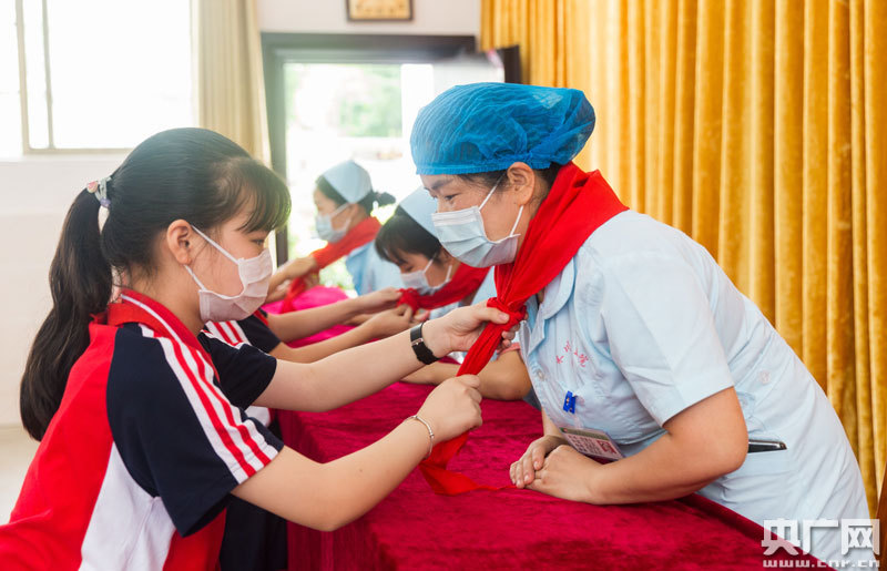 永新縣城西小學,孩子們?yōu)榘滓绿焓勾骷t領巾(央廣網發(fā) 通訊員 攝)