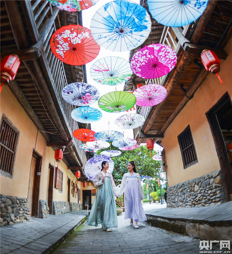 游客身著漢服漫步在雅溪古村(央廣網(wǎng) 通訊員王敏攝)