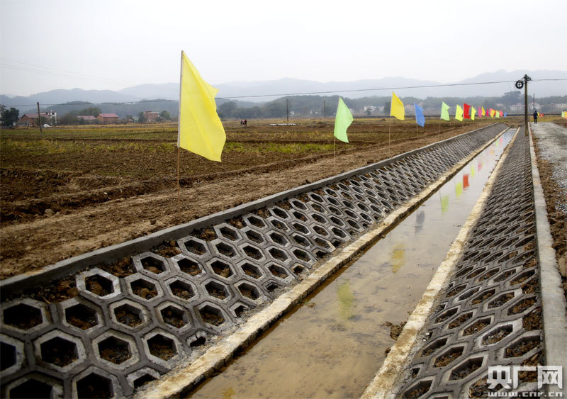 高標準農(nóng)田建設(shè)中溝渠護堤采用六角空心磚建成,牢固美觀又生態(tài)環(huán)保(央廣網(wǎng)發(fā) 通訊員供圖)