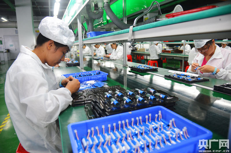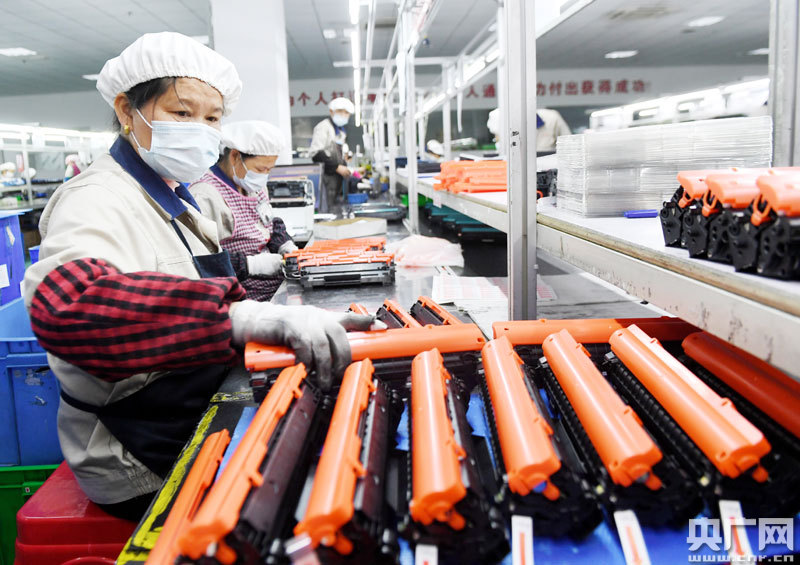 江西億鉑電子的員工在生產(chǎn)線上加工打印硒鼓(央廣網(wǎng)發(fā) 通訊員提供)