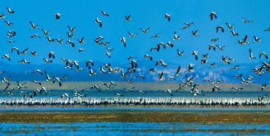 鄱陽湖是中國最大的淡水湖,國際最重要的候鳥越冬地之一。鄱陽湖上承贛、撫、信、饒、修五河之水,下接長江。豐水季節(jié)浪涌波騰,浩瀚萬頃,水天相連;枯水季節(jié)水落灘出,野草豐茂,蘆葦叢叢;湖畔峰嶺綿延,沙山起伏,沃野千里,候鳥翩飛,牛羊倘佯。“鄱湖鳥,知多少,飛時遮盡云和月,落時不見湖邊草!睌(shù)據(jù)顯示,鄱陽湖有鳥類330種,其中國家一級保護鳥類10余種、國家二級保護鳥類40多種,全球98%以上的白鶴、80%以上的東方白鸛、70%以上的白枕鶴在此越冬棲息。每年9月至翌年3月,來自全球的60多萬只珍稀候鳥飛臨江西鄱陽湖,在草洲、灘涂落戶安家、養(yǎng)育后代,形成令人嘆為觀止的“天鵝湖”和“白鶴長城”。