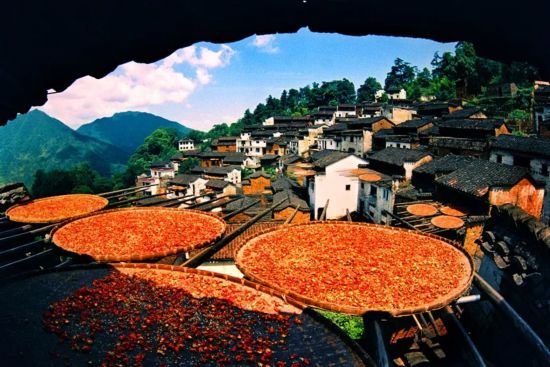 婺源是中國最美鄉(xiāng)村,春來變暖,油菜花開,小橋流水,山花爛漫,間以粉墻黛瓦、翹角飛檐的古建筑群和濃郁的鄉(xiāng)風民情,是眾多中華游子的夢里老家。秋季到來,婺源篁嶺的農(nóng)民以大地為畫板,將支架作畫筆,讓南瓜、豆角、辣椒、玉米成為作畫的素材,使整個山間村落飽經(jīng)滄桑的徽式民居土磚外墻與曬架上、圓圓曬匾里五彩繽紛豐收果實組合,繪就出世界獨一無二的“曬秋”農(nóng)俗景觀、最美的鄉(xiāng)村符號。
